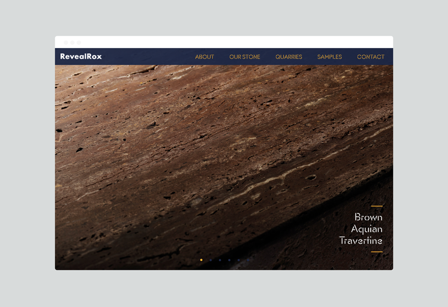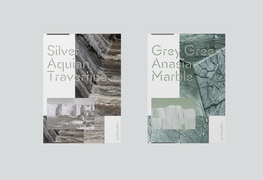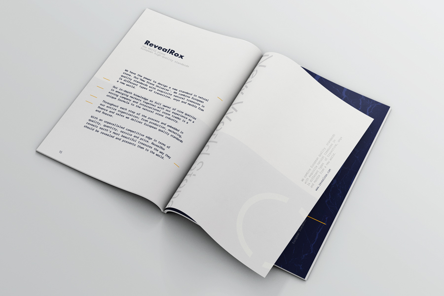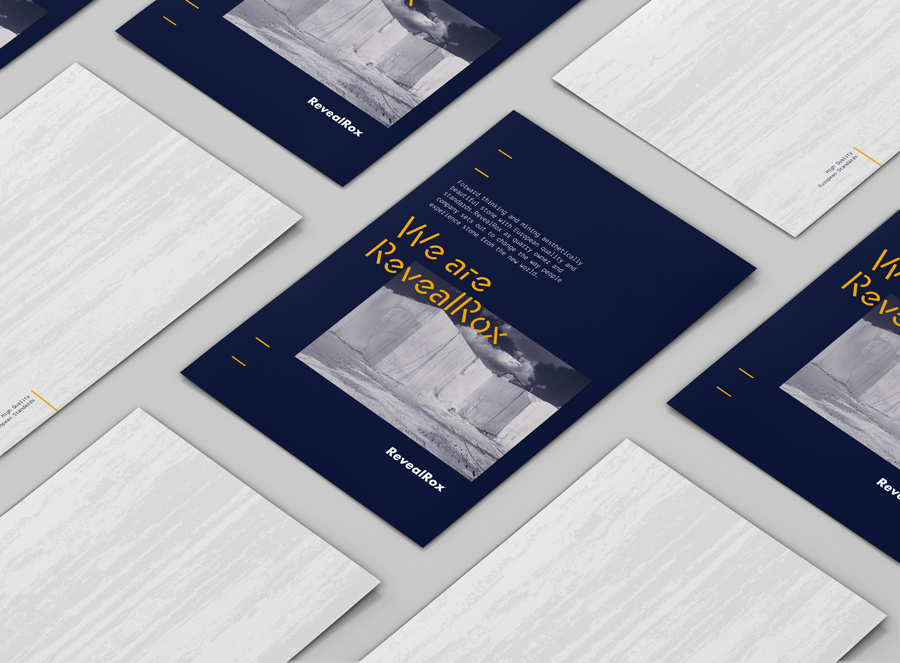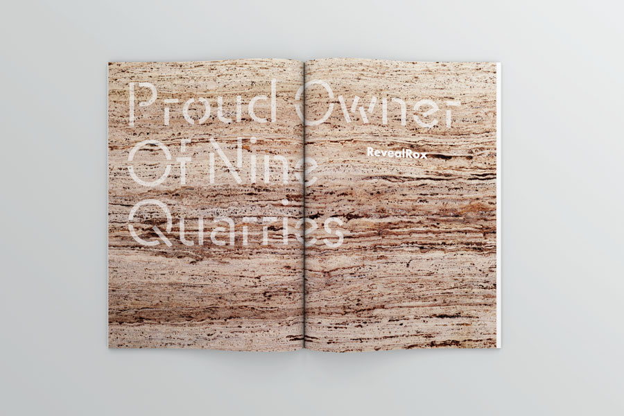 RevealRox mines beautiful natural stone. I created a new identity, featuring bold typography, working with their existing logo and color scheme. Among other things I designed a catalog and website that showcase their beautiful materials.