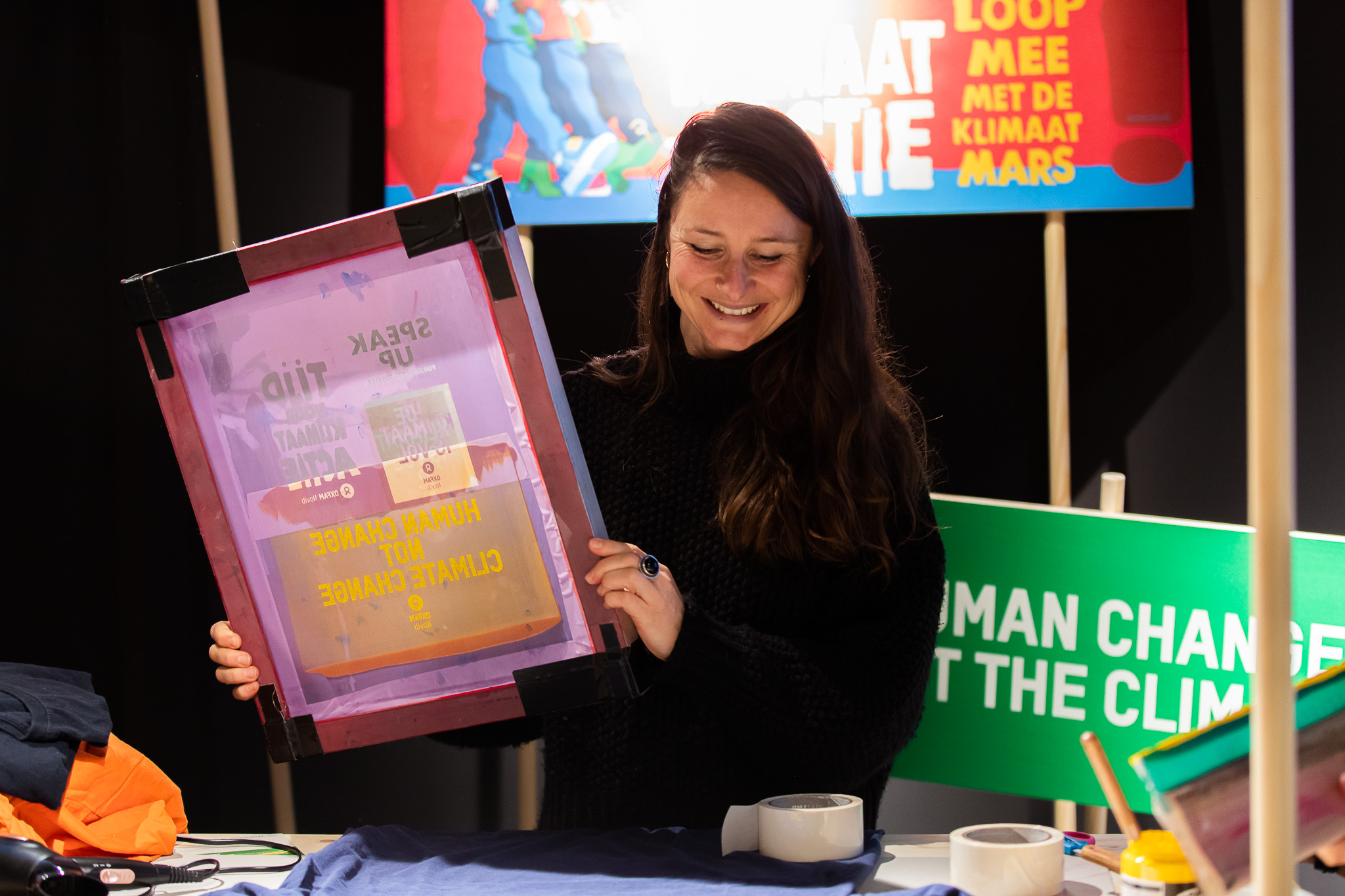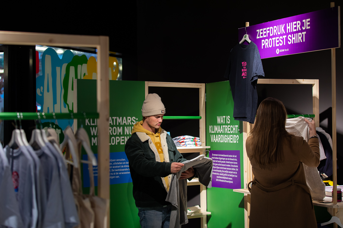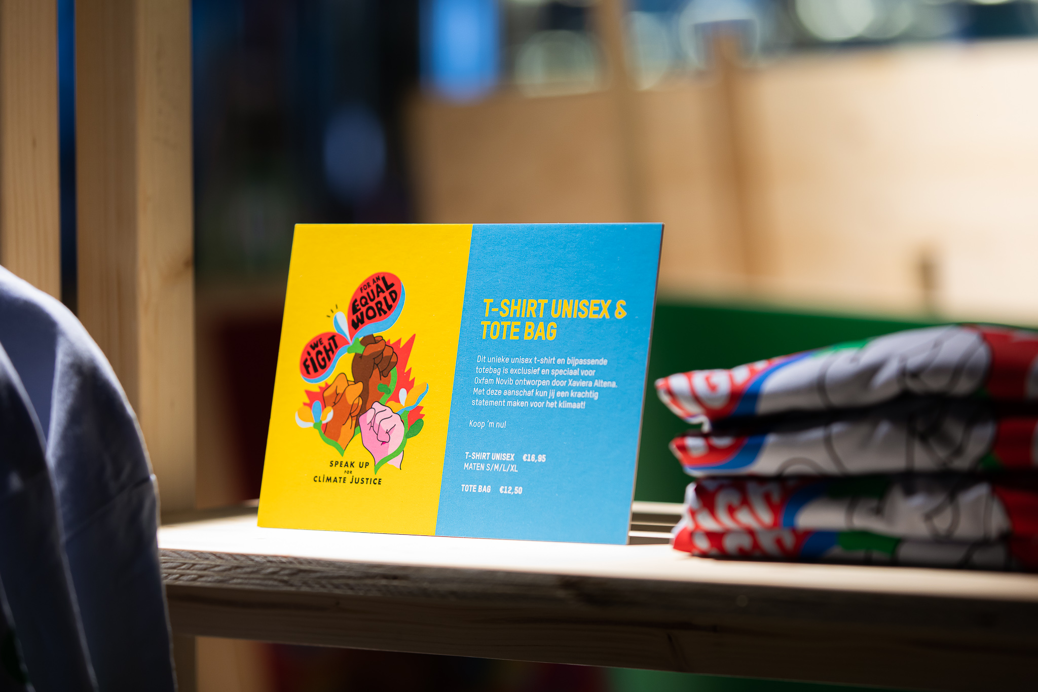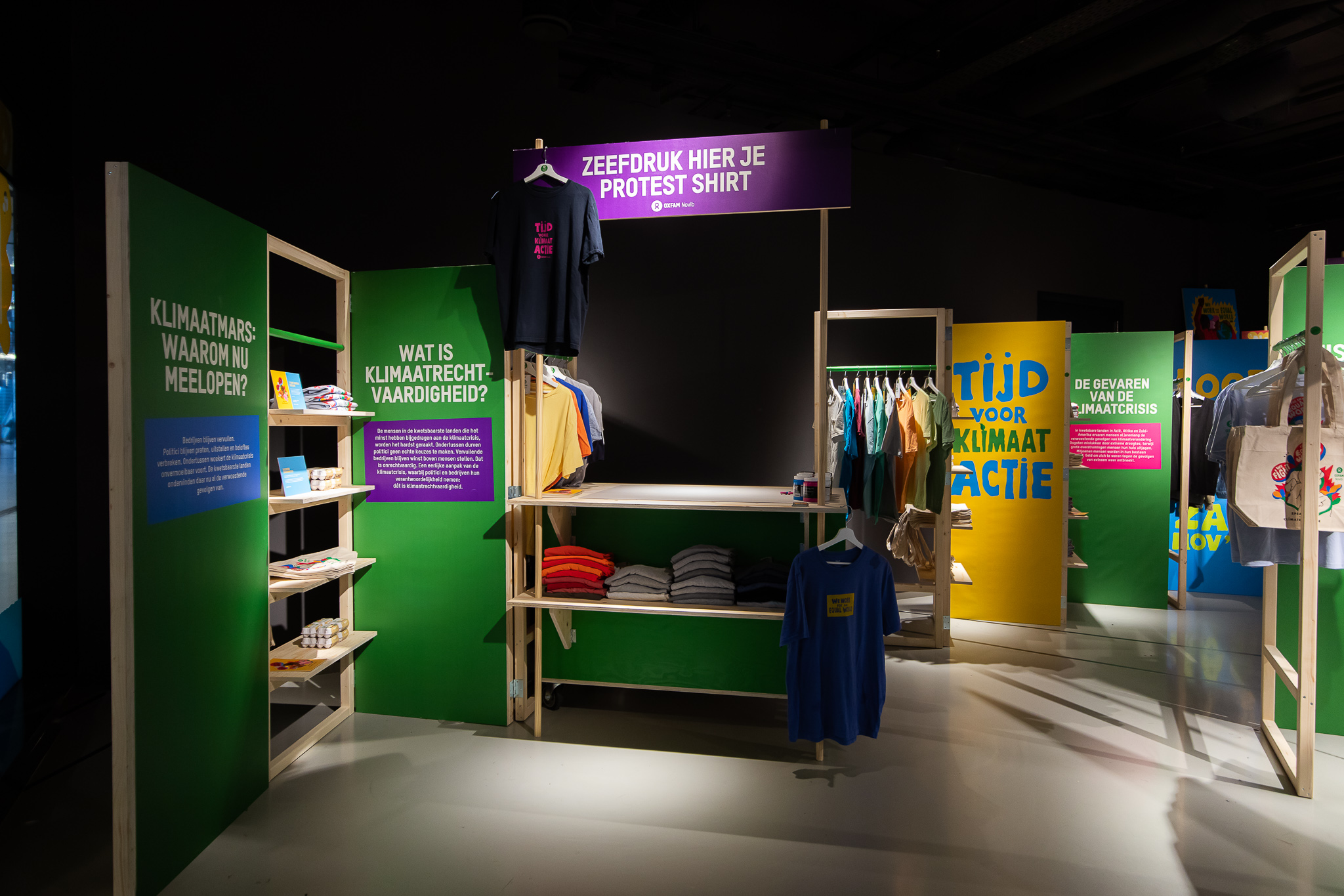 Oxfam Novib Climate Hub was created as a pop-up store to coincide with the climate march and summit in Glasgow, with the purpose of informing people about climate change and as a call to action to join the march. You could buy one of the ready-made shirts and bags or make a protest shirt by screen printing one yourself.